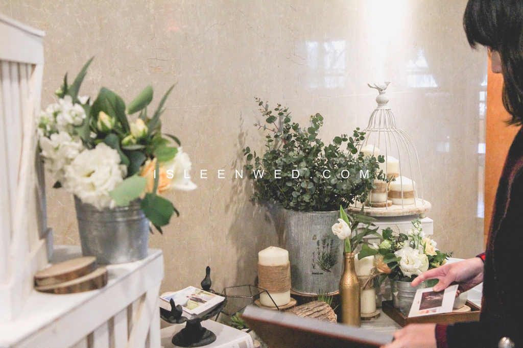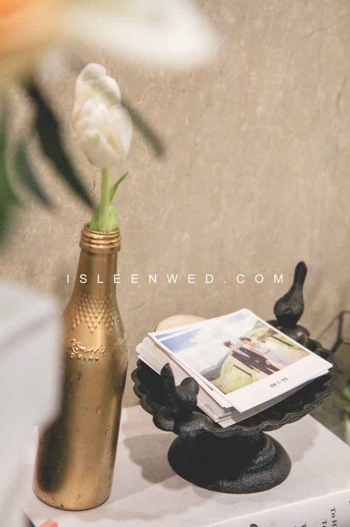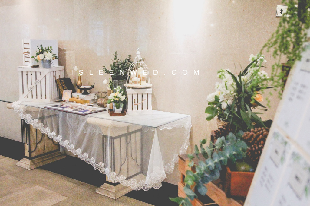 而洽好有一張復古的桌面!我們利用了桌子的原調戴上蕾絲紗,點綴了鮮花與道具,襯托了清新的氣息